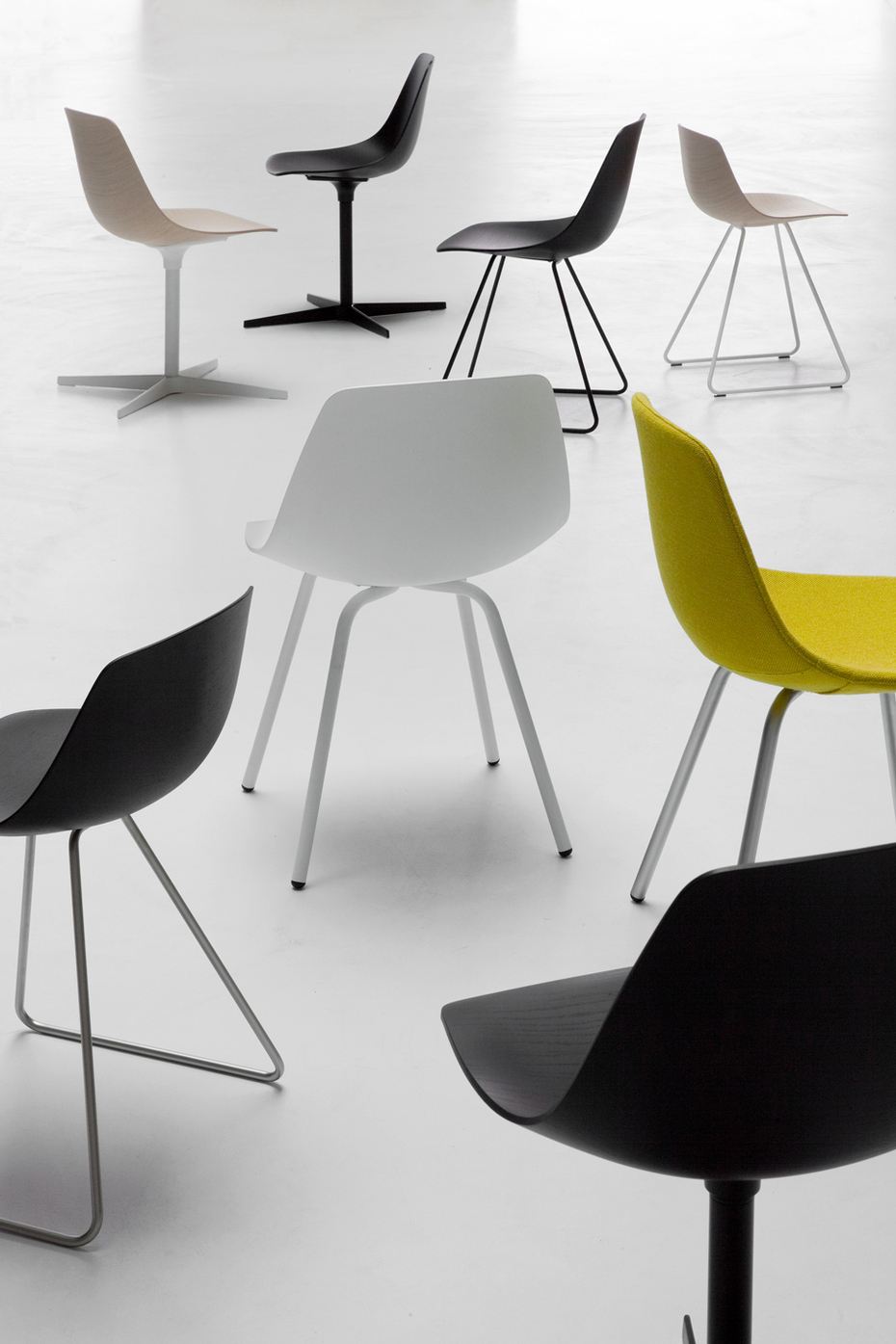 Eine Schalenform aus Holz, umhüllend: Stuhl und Hocker - mit unterschiedlichen Gestellen und in verschiedenen Höhen - lassen sich vielseitig mit Tischen jeglicher Art kombinieren. Die Form unterstützt den Rücken, gibt ihm Halt und folgt der Sitzposition mit einer weichen Linie.