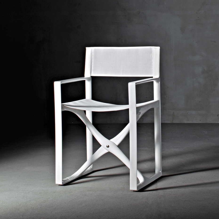 La Regista ist eine Überholung des klassischen Regisseurstuhls aus Kohlenstofffaser. Dank dieses Materials ist der Stuhl extrem leicht und misst zusammengefaltet nur 14 cm. Der hochwiderständige Stoff wird normalerweise für die Außeneinrichtung auf Booten verwendet.